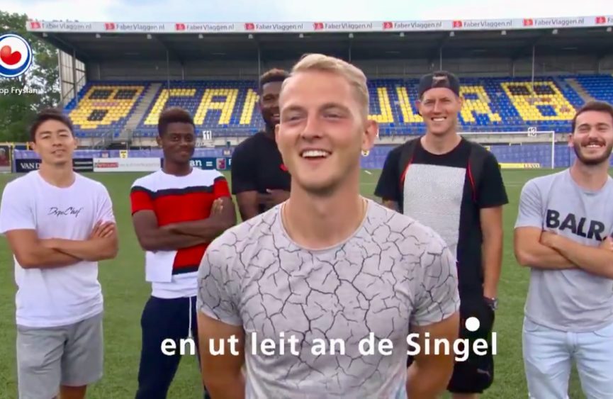 Iedereen die ooit bij SC Cambuur is geweest weet welk nummer er wordt gedraaid na een doelpunt: ’t Woanskip. Logisch dus dat de buitenlandse spelers na de Nederlandse les voor de camera van Omrop Fryslan gingen oefenen.