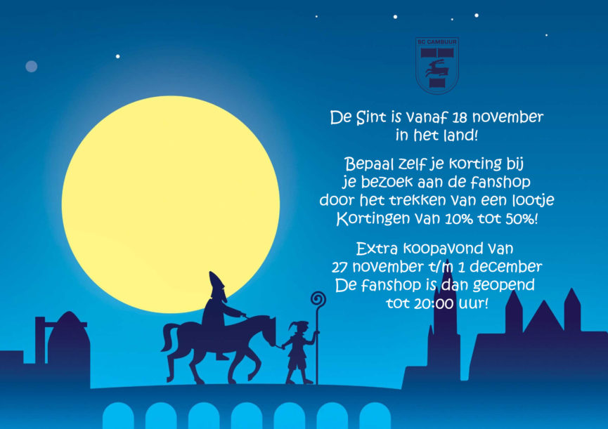 De feestdagen staan weer voor de deur en dan kun je als hulp-Sinterklaas of -Piet natuurlijk ook weer terecht in de Cambuur Fanshop! Van 18 november tot 5 december bepaal je dit keer bovendien -door het trekken van een lootje- helemaal zelf hoeveel korting je ontvangt op alle officiële merchandise van SC Cambuur. Dit kan zelfs oplopen tot een korting van 50% (minimaal 10%). Kom dus snel naar onze Fanshop (rechts naast de Jumbo op het Cambuurplein) voor al je sinterkerst inkopen!