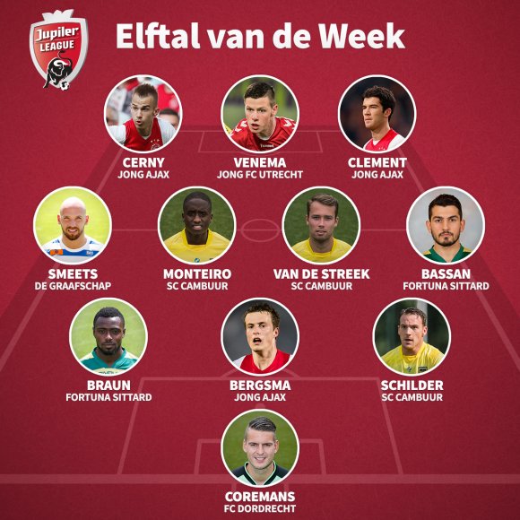 Na elke speelronde maakt de Jupiler League in samenwerking met Voetbal International het Elftal van de Week bekend. Dit keer zijn daarin maar liefst drie spelers van SC Cambuur terug te vinden. Jamiro Monteiro, Sander van de Streek en Robbert Schilder danken hun uitverkiezing aan hun puike optreden in het duel tegen NAC Breda. Onderstaand vind je het volledige Elftal van de Week.